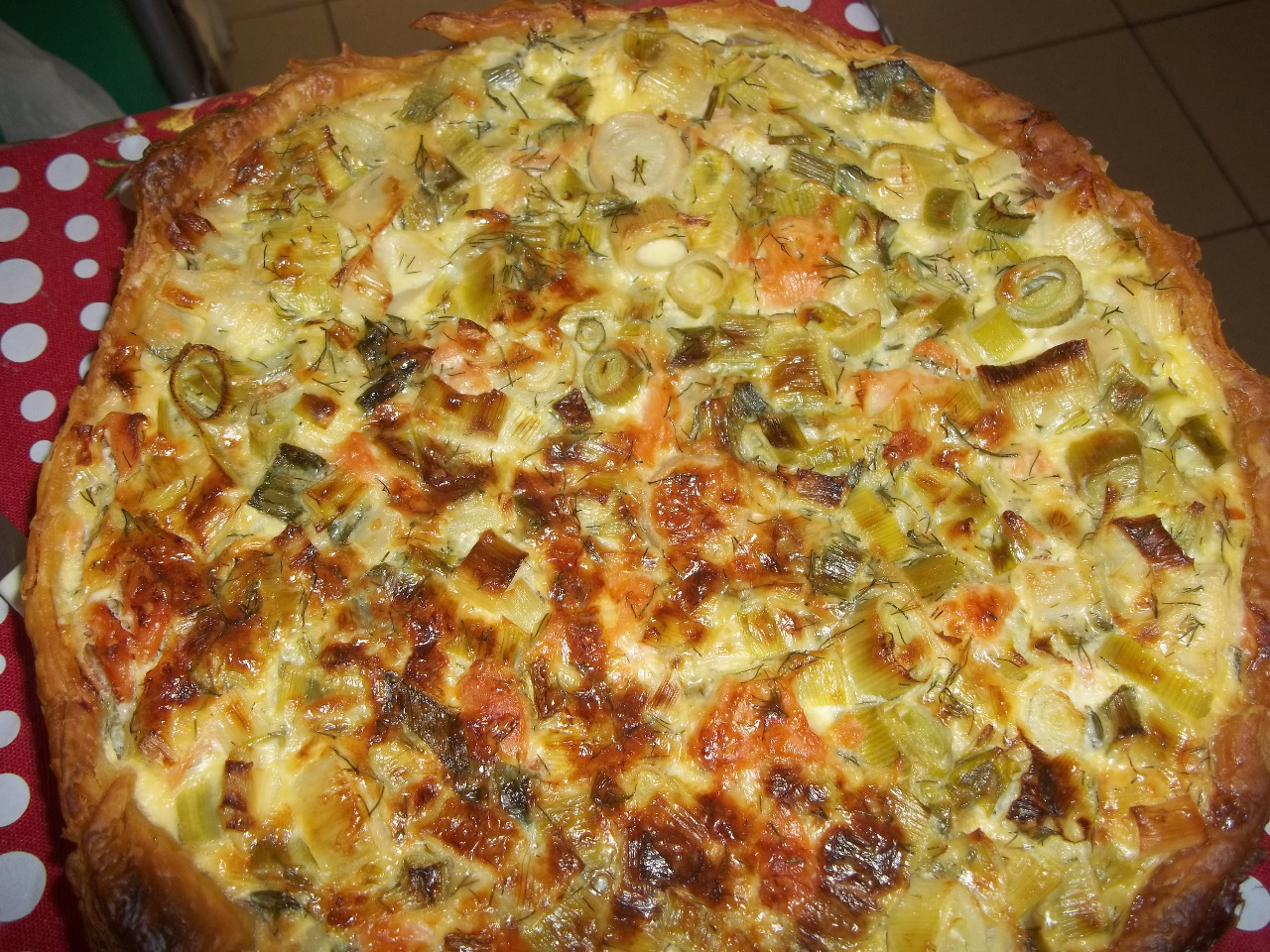 Στρώνουμε το αντικολλητικό χαρτί στην ταρτιέρα, τοποθετούμε το φύλλο έτσι ώστε να καλύπτει καλά τα τοιχώματα πιέζοντας με τα χέρια, κόβουμε τα κομμάτια που περισσεύουν και ψήνουμε στους 180ο για 20΄μέχρι να πάρει ένα ελαφρύ χρυσαφί χρώμα.Προηγουμένως-για να μην φουσκώσει πολύ-έχουμε τρυπήσει το φύλλο σε πολλά σημεία με ένα πιρούνι. Σ΄αυτό το διάστημα πλένουμε τα πράσα,τα κόβουμε σε ροδέλες και τα βράζουμε σε αλατισμένο νερό να μαλακώσουν.Τα σουρώνουμε και τα αφήνουμε σε μπόλ να κρυώσουν. Προσθέτουμε το τυρί σε μικρά κομμάτια,το σολωμό κομμένο με το χέρι-τα ψιλοκομμένα κρεμμυδάκια,τον άνηθο,τα αυγά ελαφρώς χτυπημένα την κρέμα γάλακτος, αλάτι,πιπέρι και ανακατεύουμε. Αδειάζουμε την γέμιση στην μισοψημένη τάρτα και συνεχίζουμε το ψήσιμο για 45' στους 180ο. Αφήνουμε να κρυώσει και σερβίρουμε με μία ωραία πράσινη σαλάτα.