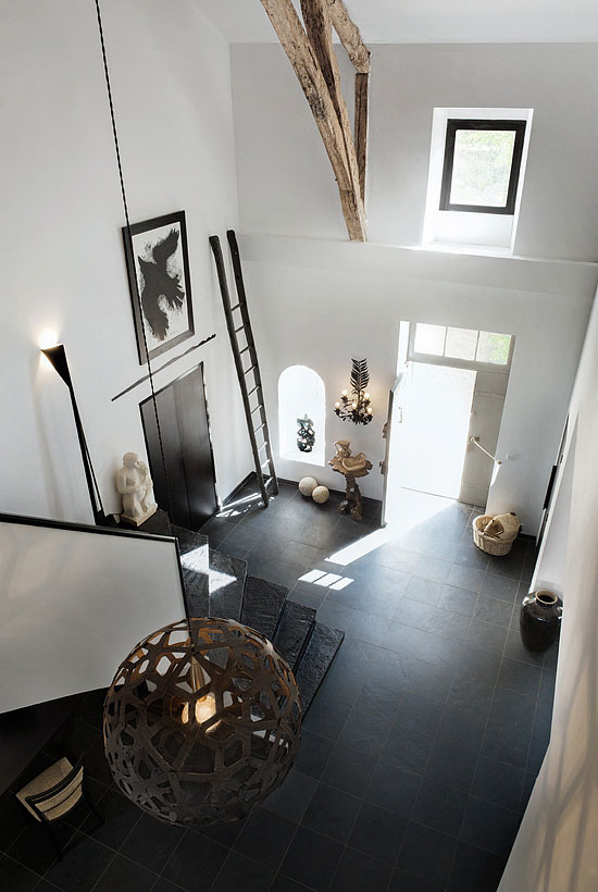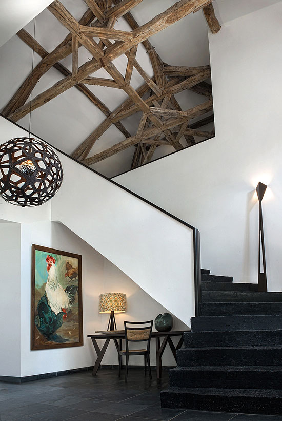Η ιδέα της ανοικτής κάτοψης με ομαλή μετάβαση απο τις περιοχές χαλάρωσης στην περιοχή της κουζίνας,με μια μεγάλη εστία ως μέσο κατασκευής,χαρακτηρίζεται από ακάλυπτους στύλους δοκάρια και τις ασβεστωμένες περιοχές της κατοικίας.Συμπεριλαμβάνεται ένα ευέλικτο πατάρι πάνω από το τρίκλινο δωμάτιο .