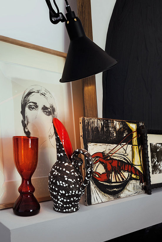 Μωβ-φιμέ ακρυλικό πάνελ διαχωρίζει την περιοχή κουζίνα- τραπεζαρία από το σαλόνι . Αυτοκόλλητα ντοματίνια και ένα ασημένιο πηρούνι αγκαλιά ,pop επιρροή της τέχνης.