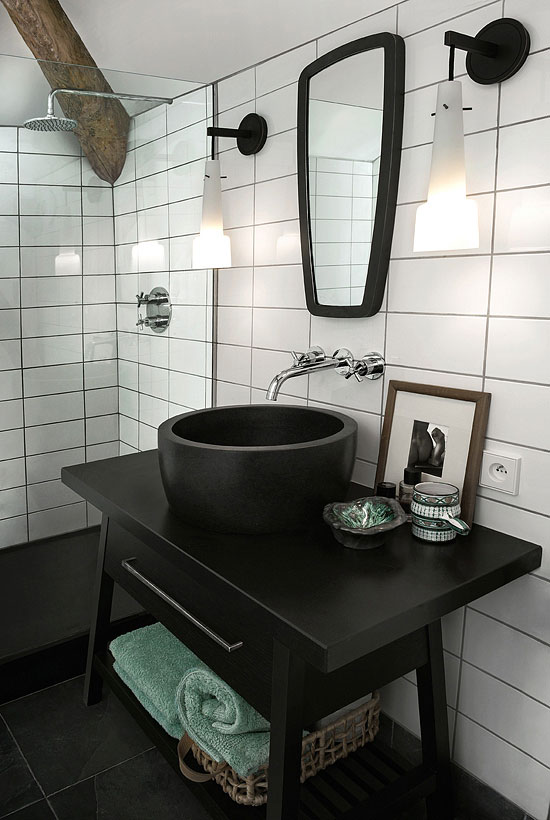 Οι φωτογραφίες και τα αρχιτεκτονικά στοιχεία δεν λείπουν ακόμη και στο μπάνιο . Ένα μοναδικό μπάνιο με μεγάλες μπαλκονόπορτες διαφάνεια και πέτρινους τοίχους από τούβλα κοντά στην μπανιέρα. Οι αντιθέσεις φως και σκιά -φωτεινά και σκούρα χρώματα -συμπληρώνονται από το φυσικό καφέ ξύλο. Μέσα από κάθε παράθυρο προβάλλει το εκπληκτικό τοπίο που προσφέρουν τα δασωμένα βουνά. Είναι ένα σπίτι που προσφέρει προστασία της ιδιωτικής ζωής, οικειότητα, άνεση,και ότι χρειάζεται για να απολαμβάνει κανείς το χρόνο που δαπανά στο σπίτι.